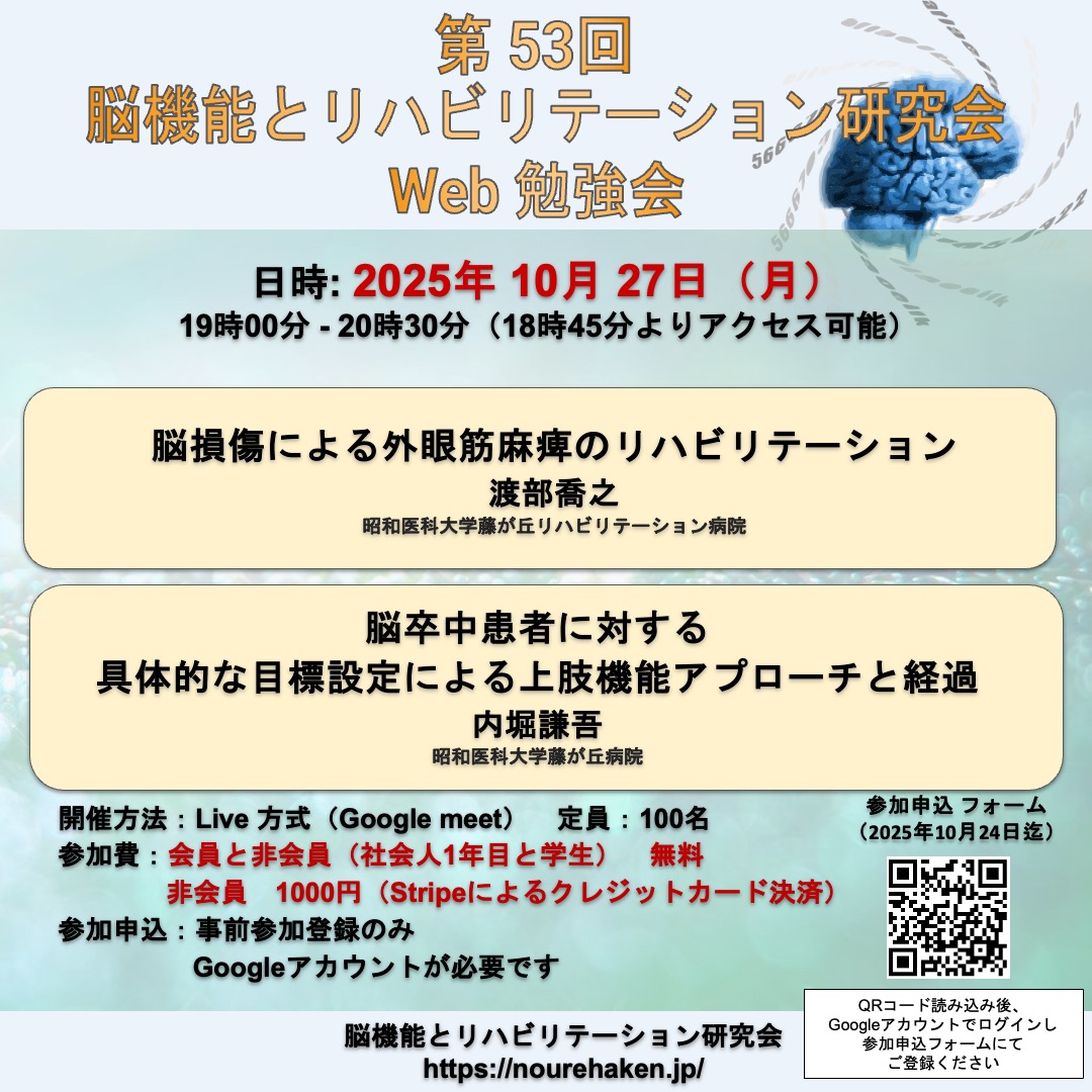 是非,脳リハ研Web勉強会 にて,皆様の現場でのご経験を情報共有して頂けますと幸いです.どうぞよろしくお願い申し上げます.